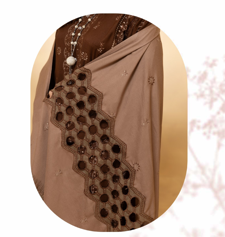 Experience refined winter luxury with Fantak ANDAAZ Vol.02, a Luxury 3 Piece Unstitched Collection crafted for elegance and comfort. Made from Premium Dhanak Fabric, each suit features beautiful intricate embroidery paired with a Fancy Woolen Embroidered Shawl, creating a stunning winter look that is classy, warm and premium in every detail.