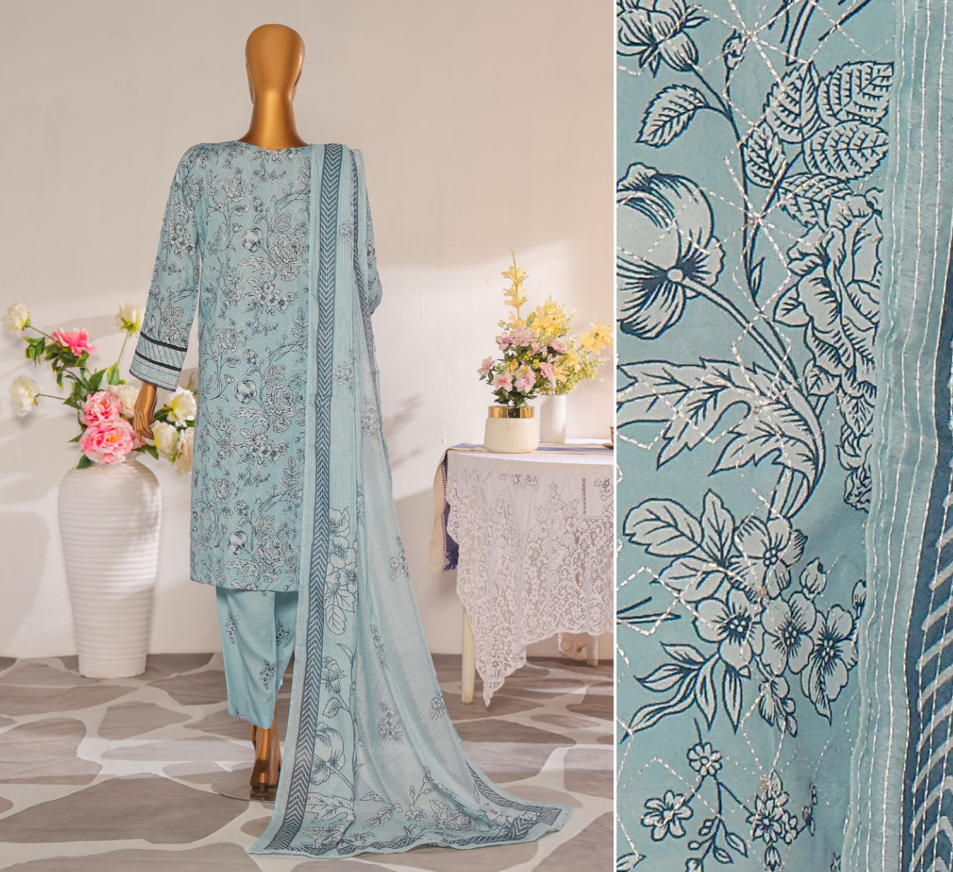 Experience ultimate comfort and refined style with Visit N Buy's exclusive Unstitched Mother Linen Embroidered Collection. This luxurious 3-piece suit is crafted from premium, high-quality Mother Linen Fabric, known for its excellent texture and warmth. The suit features exquisite Embroidery Work on the shirt and is elegantly paired with a matching Embroidered or Printed Dupatta, perfect for sophisticated daily wear and occasions this season.