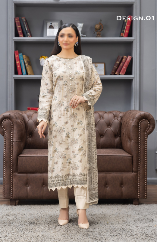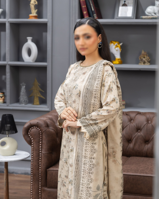 Unfold winter charm with Fantak TABEER Vol.01, a 3 Piece Unstitched Staple Slub Embroidered Collection featuring 9 mesmerizing designs. Crafted on premium Staple Slub fabric, this collection is perfect for the winter season, combining softness with durability. Each suit is styled with Digital Print Embroidery and paired with a Digital Print Diamond Doriya Dupatta, adding a touch of elegance and finesse.
