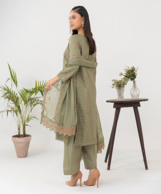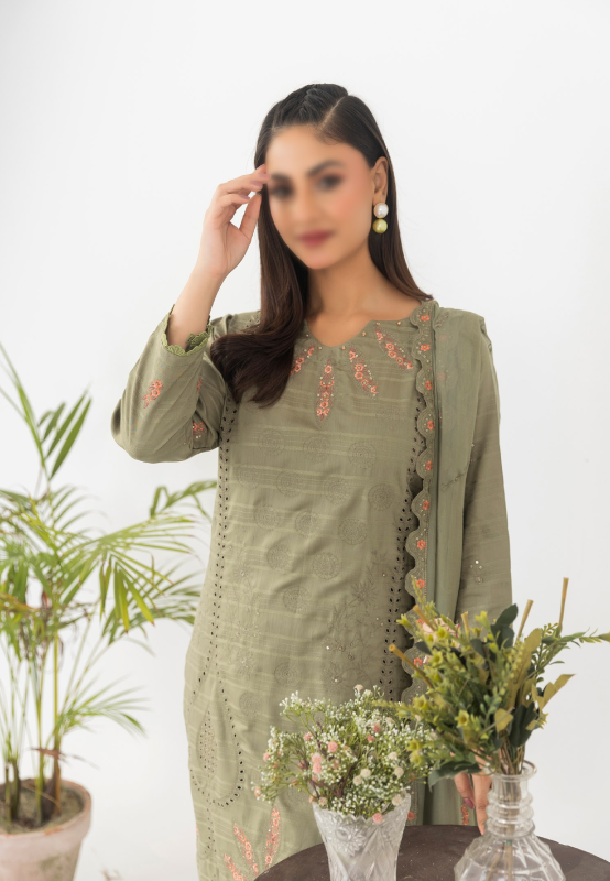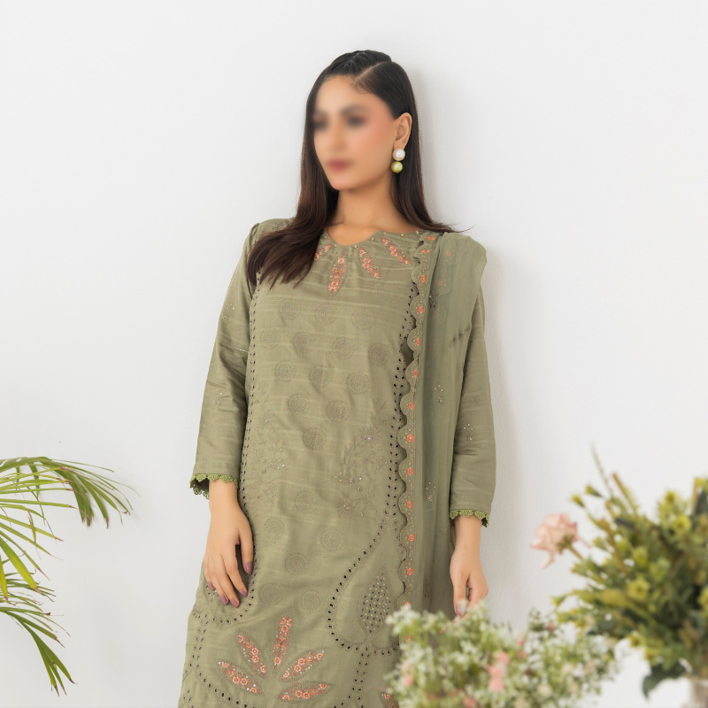 l 3 Piece Unstitched Suit — Shirt, Trouser & Dupatta