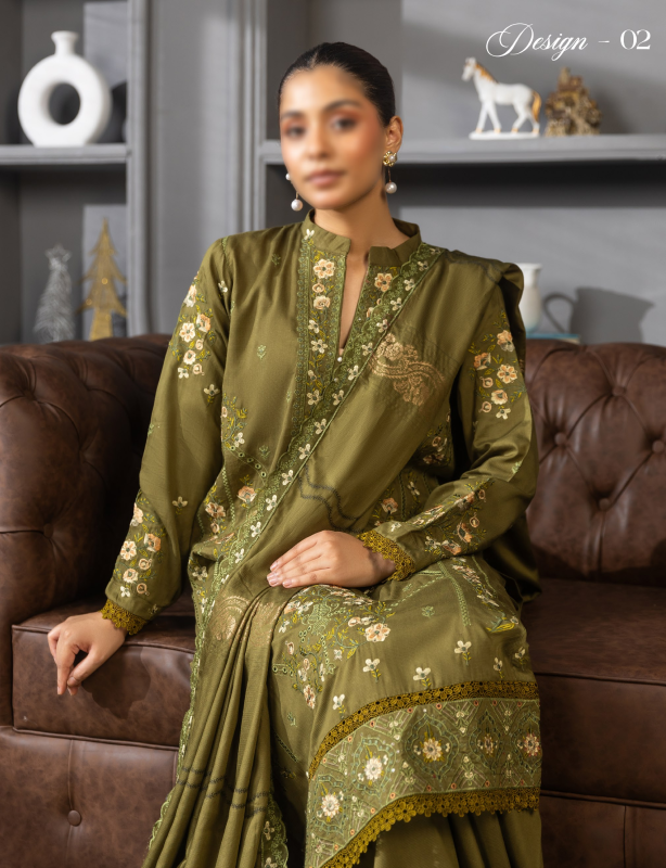 Unveil a new level of sophistication with Fantak TASSUR Vol.02, a Luxury 3 Piece Unstitched Collection designed for those who appreciate elegance with comfort. Crafted from Fancy Doriya Viscose, each outfit features exquisite embroidery work and comes with a Jacquard Embroidered Dupatta, making it the perfect choice for your winter wardrobe.